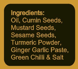 Ingredients: Refined Soyabean Oil,Cumin Seeds,Mustard Seeds,Sesame Seeds,Turmeric Powder,Ginger garlic paste,Green chilli,Iodised salt.